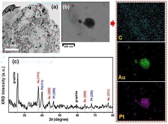 Characterization of the TG/Au52Pt48 catalyst: (a) TEM image; (b) TEM-EDS mapping images for C, Au, and Pt; and (c) XRD pattern.