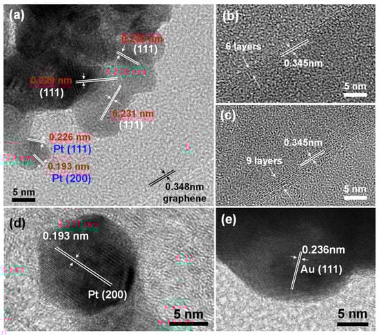 Figure 3 further displays the detailed crystallographic structures of the TG mesh decorated by the metallic NPs. The HRTEM image displayed in Figure 3a, taken from the TG/Au52Pt48 catalyst, clearly exhibits four distinct sets of lattice fringes. The observed interlayer distances of 0.230, 0.229, and 0.231 nm are closely in agreement with the (111) lattice spacing values of the cubic Au and Pt reported in [], suggesting the formation of binary AuPt nanostructures. Moreover, the observed interlayer distances of 0.226 and 0.193 nm are consistent with the d-spacing of Pt (111) and Pt (200) lattice planes, respectively, as reported in [,]. The result indicates the presence of pure Pt NPs besides binary AuPt NPs. HRTEM images taken on the wall-edge areas (see Figure 3a–c) of the TG/Au52Pt48 catalyst directly reflected the graphene layered structure, which contains 6–9 graphene layers. Figure 3d,e show the HRTEM results acquired from the TG/Pt0.241 and TG/Au0.258 catalysts, respectively. Interlayer spacing values of 0.193, and 0.236 nm were observed, consistent with the lattice spacing values of Pt (200) and Au (111) [,], respectively.