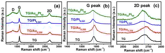 (a) Raman spectra of the TG, TG/Au0.258, TG/Pt0.241, and TG/Au52Pt48 catalysts; (b) the shift of G peak; (c) the shift of 2D peak.