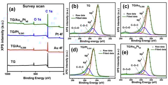 (a) XPS survey scans of four different TG-based catalysts, exhibiting the dominant C 1s and weak O 1S peaks. (b–e) C 1s narrow scans of the TG, TG/Au0.258, TG/Pt0.241, and TG/Au52Pt48, respectively, containing sp2, sp3 bonding, and small quantity of oxygen-attached carbon functional group.