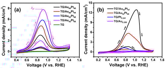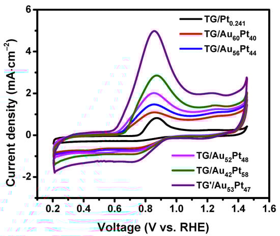 The Pt-based catalysts exhibit better methanol oxidation activity in alkaline environments than in acid solutions because of much weaker bonding of intermediates to the electrocatalyst in alkaline media []. Consequently, CV profiles of methanol oxidation were measured in a solution of 0.5 M KOH + 1 M CH3OH on the TG-based catalysts with the scan rate of 20 mV/s. Bimetallic Pt-based catalysts exhibit a preeminent catalytic performance compared to pure Pt-based catalysts, due to the combined synergistic strain and ligand/electronic effect [], which can promote the oxidation of CO to CO2 thus reactivating Pt active sites. The overall reaction on the binary AuPt catalyst for MOR in alkaline media obeys the “bifunctional mechanism” and can be described by the following equations []: