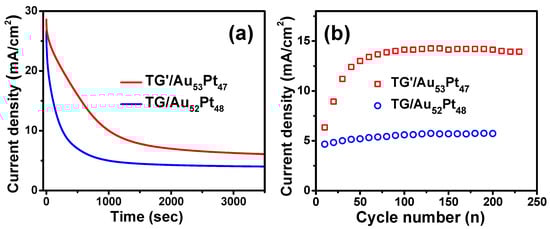 At a constant potential, methanol was oxidized and the oxidized carbonaceous intermediates were adsorbed on the electrocatalytic surface which produced the poison and deactivation of the electrocatalytic surface, leading to strong initial decay of current density in the chronoamperometric curves []. To further investigate long-term stabilities of the TG-based catalysts, chronoamperometric curves of both TG/Au52Pt48 and TG’/Au53Pt47 catalysts were measured at the potential of 1 V (vs. RHE) in a solution of 0.5 M KOH + 1.0 M CH3OH. Figure 10a plots the time evolution of current densities of both catalysts. The quick decay of current densities of both catalysts at the early stage during methanol oxidation process is primarily attributed to CO poisoning effect [,]. Compared to TG/Au52Pt48 catalyst, the TG’/Au53Pt47 catalyst exhibited a slower decay rate due to its better CO tolerance capability. Furthermore, the TG’/Au53Pt47 catalyst also yielded a higher initial and final current densities owing to its smaller charge–transfer resistance compared to those of the TG/Au52Pt48. This suggests a better stability and superior poisoning-tolerance ability of TG’/Au53Pt47. Moreover, peak current densities of forward scans of both catalysts vs. cycle number were measured to assess their long-term stabilities in methanol oxidation (see Figure 10b). Both catalysts exhibited great stability and high efficiency in methanol oxidation after 200 scanning cycles. Figure S11 displays the CVs of methanol oxidation at cycle number 50 and 200 of both catalysts. The shapes and peak current densities of both CVs remained unchanged, indicating the high stability of both catalysts.