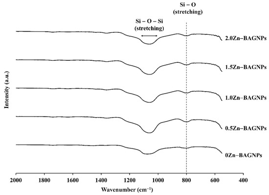 FTIR spectra of all particles exhibited characteristic bands of BAGs absorption bands (Figure 4). Si-O-Si asymmetric stretching was observed at 1050 cm−1 [43], while Si-O-Si symmetric stretching was seen at 800 cm−1 [44]. Taken together with the XRF results, it could be inferred that incorporated Ca, Sr and Zn did not alter the silica network. Moreover, different amounts of Zn had no effect on bonding within the particles.