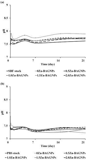 pH of (a) SBF and (b) PBS solution as a function of time after immersion of Zn-BAGNPs.