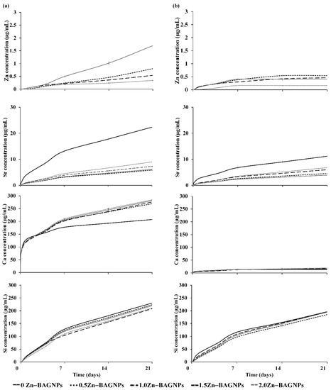 The released Si, Ca, Sr, and Zn from Zn-BAGNPs could be observed through solu-tion-mediated dissolution, as the particles were degraded over the incubation period of up to 3 weeks. An increase in the Si, Ca, Sr, and Zn concentrations was observed with an increase in incubation time, and more Si, Ca, Sr, and Zn ions were released in the SBF solution compared to those in the PBS solution. In the SBF solution (Figure 6a), the release of Si gradually increased with time for a sustained period through the degraded silica network. Ca release increased sharply in the first 24 h, followed by steady release for a sustained period, while Sr release was gradually increased. The Ca and Sr release were similar to previous studies [19]. The increase in Sr concentration released from 0Zn-BAGNPs was two- to three-fold compared to Zn-containing particles in the SBF solution, as Sr was more incorporated inside the particles. Zn release increased with immersion time for 0.5Zn-BAGNPs, 1.0Zn-BAGNPs, and 1.5Zn-BAGNPs. Interestingly, the Zn released from 2.0Zn-BAGNPs rapidly increased after 4 days of immersion in the SBF solution. In the PBS solution (Figure 6b), Si release showed a similar trend to that of Si in the SBF solution, but Si concentration showed lower release in the PBS solution. Ca release remained constant over the immersion period. Sr release gradually increased with immersion time for all particles. Zn release slightly increased in the first 7 days, before levelling off. Most of the samples initially released a few Zn ions after 1-day immersion in both solutions.