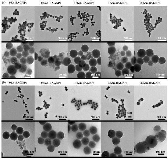 It was previously demonstrated that Sr-containing BAGNPs (Sr-BAGNPs) pro-moted ion release that could potentially enhance mineralizing actions and osteogenic differentiation [24,27]. However, adding Zn to improve the bioactivity of BAGNPs was challenged. Our hypothesis was that Zn-containing dense monodispersed bioactive glass nanoparticles (Zn-BAGNPs) could enhance bone formation due to the released therapeutic ions, including Si, Ca, Sr, and Zn. The aim of this study was to prepare Zn-containing dense monodispersed bioactive glass nanoparticles (Zn-BAGNPs) with a diameter of 130 ± 20 nm through the sol–gel process and two-step post functionalization.