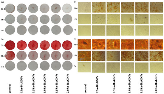 PDLSCs were cultured under both basal and osteogenic differentiation media containing the Zn-BAGNPs, at a concentration of 250 µg/mL for 1 week, 2 weeks, and 3 weeks, to evaluate their osteogenic differentiation. At each of the time intervals, differentiated PDLSCs under both media enabled the detection of the calcified formation of bone mineralization, using Alizarin Red S staining, as Alizarin Red S was commonly used to stain calcium deposits in vitro. Under the basal condition, calcium formation was significantly observed after 3 weeks in culture (Figure 10a,c). Under osteogenic conditions, calcium deposits were stained strongly after 2 weeks in culture, in all treated and untreated cells (Figure 10b,d).