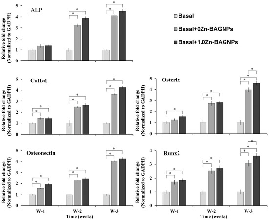 To evaluate the osteogenic properties, the gene expression levels of ALP, Col1a1, Osteonectin, Osterix, and Runx2 of the treated PDLSCs were quantified under both basal (Figure 11) and osteogenic conditions (Figure 12) via qPCR. The expression levels of ALP, Col1a1, and Osteonectin were statistically significantly up-regulated in treated PDLSCs with 0Zn-BAGNPs and 1.0 Zn-BAGNPs after 1, 2, and 3 weeks of culture, both in the presence and absence of osteogenic supplements (* p < 0.05). The expression of Runx2 and Osterix in the treated PDLSCs was statistically significantly, having increased after 1 week and 2 weeks under the basal and osteogenic conditions, respectively.