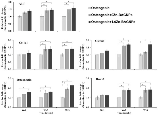 Quantitative real-time reverse transcriptase PCR analysis showing the expression of osteogenic marker genes in PDLSCs treated with Zn-BAGNPs, cultured under the osteogenic condition for 1 week, 2 weeks, and 3 weeks. Gene expression was normalized to GAPDH (a housekeeping gene) transcript levels. The data represent two independent experiments. The values are the mean ± SD (n = 3). The expression of osteogenic marker genes was significantly up-regulated in cells treated with particles compared to untreated cells. * above the bars represents a significant difference between treated PDLSCs versus untreated PDLSCs under the osteogenic condition at the same time interval (* p < 0.05).