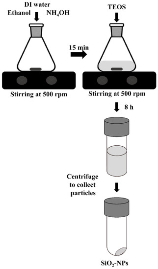 BAGNPs without ZnO were synthesized using the modified Stöber method de-scribed in previous work [18]. The sol–gel-derived dense silica nanoparticles (SiO2-NPs) with a diameter range of 100–140 nm were first synthesized. Then 24.7 mL of Milli-Q water, 197.5 mL of ethyl alcohol (99.5%), and 2.9 mL of ammonium hydroxide were mixed in a 500 mL Erlenmeyer flask at a stirring rate of 500 rpm for 15 min. After this, 15.0 mL of tetraethyl orthosilicate (TEOS) was then gently added into the mixed solution and left in the stirrer for at least 8 h in order to complete the hydrolysis and poly-condensation reactions. A white solution was obtained as the hydrolysis and poly-condensation reactions of the silica precursor occurred simultaneously to form the silica network (Si-O-Si) of silica nanoparticles (SiO2-NPs). SiO2-NPs were collected by centrifugation at 5000 rpm for 40 min and then were simultaneously washed with ethanol (two times) and distilled water (one time) to remove unreacted substances. The SiO2-NPs were suspended in Milli-Q water (Scheme 1).