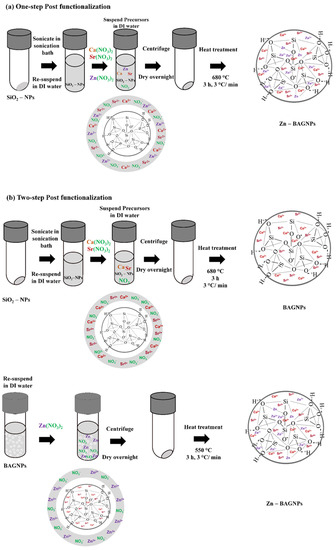 Zn-BAGNPs with post functionalization to incorporate therapeutic cations (a) one-step post-functionalization and (b) two-step post-functionalization.