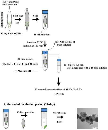 An amount of 30 mg of Zn-BAGNPs was suspended with 5 mL of media in dialysis tubing that had a molecular weight cut-off of 10 kDa, and immersed into 15 mL of media in 50 mL Falcon® Conical Centrifuge Tubes modified from [19]. All samples were incubated in an incubating shaker at 37 °C shaking at 120 rpm for 1 h, 4 h, 1 day, 7 days, 14 days and 21 days. At each of the time intervals, the pH of the solution was monitored at each specific interval over the period of study, and 0.5 mL of the bulk solution was collected and then immediately replaced with 0.5 mL of the fresh solution. The collected solution was diluted in 2M nitric acid with a 10-fold dilution factor. The ion concentrations of Si, Ca, Sr, and Zn were measured using inductively coupled plasma optical emission spectroscopy (ICP-OES) (Scheme 3). At the end of the incubation period, the Zn-BAGNPs were collected by centrifugation and then immediately washed with ethanol and subsequently with acetone to terminate the reactions [38]. The fresh SBF and PBS solutions served as a control.