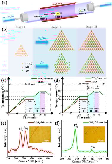 WS2/MoS2 LHs and VHs were fabricated via one-pot CVD. The schematic diagrams of the CVD setup for the growth of the heterostructures the growth process of the VHs are shown in Figure 1a,b, respectively. Distinct from the conventional placements of the precursors, we loaded sulfur powder at the downstream region. This positioning strategy only allows a very small flux of S to get involved in the growth stages by slow diffusion. Therefore, the MoO3 is prevented from being exposed to a large amount of S, whereby decreasing the cross-contamination at the resultant heterointerface []. The temperature programs for growing the WS2/MoS2 LHs and VHs are shown in Figure 1c,d, respectively. The growth process can be divided into three stages: Stage Ⅰ represents the growth of the bottom MoS2 monolayer, and Stage Ⅲ represents the growth of the top WS2 monolayer at a higher temperature, and Stage Ⅱ is a transition stage. Since the boiling point of WO3 is higher than that of MoO3, the WO3 is placed closer to the Au substrate and remains at the same location during the growth. On the contrary, MoO3 powder is transited from a room temperature region into the growth area (~700 °C) as soon as the growth program reaches Stage Ⅰ, and returns to the room temperature region to cut off the Mo supply immediately after Stage Ⅰ. More details of the synthesis are described in the Experimental Section. Typical Raman spectra from MoS2 and WS2 monolayer domains were shown in Figure 1e,f, respectively. The Raman peaks centered at 384.5 and 403.5 cm−1 correspond to  and A1g vibrational modes of MoS2, while Raman peaks located at 419 cm−1 and 355.5 cm−1 correspond to  and A1g vibrational modes of WS2.  is an in-plane vibration mode, corresponding to the in-plane vibrations of Mo/W and S atoms, while A1g is the out-of-plane vibration mode of the two S atoms along the z-axis of the TMD unit cell []. Additionally, the frequency differences (Δ) for MoS2 and WS2 were measured to be 19 and 63.5 cm−1, respectively, confirming that the as-grown MoS2 and WS2 are both monolayer []. The insets present the optical microscopic images of the as-grown MoS2 and WS2 single crystals on Au foils. The lateral sizes of the MoS2 and WS2 domains are as large as ~10 and ~15 μm, respectively. The growths of the MoS2 and WS2 domains with similar sizes on SiO2/Si and c-sapphire substrates (Figure S1) are much slower (20 min) than those on Au foils (5 min), indicating that Au plays a catalytic role in the synthesis.