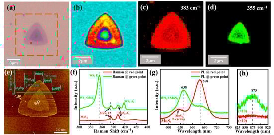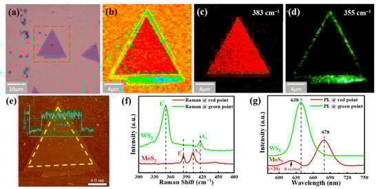 Following the growth process in Figure 1f, the WS2/MoS2 LHs consisting of a MoS2 monolayer inside and a WS2 monolayer outside were produced. Figure 2a shows the optical image of as-transferred WS2/MoS2 LH on the SiO2/Si substrate. The edge length of the inner MoS2 monolayer is about 10 μm. Raman mapping for the area is labeled by a brown dotted square, and the intensity mappings for the Raman characteristic peaks of MoS2 (383 cm−1) and WS2 (355 cm−1) are shown in Figure 2b–d, respectively. To measure the thickness of the as-prepared WS2/MoS2 LH, AFM was carried out. Figure 2e shows the AFM surface morphology and the corresponding height profiles across the whole WS2/MoS2 LH. The thickness of the sample is about 0.8 nm, thereby proving the monolayer characteristics of the as-synthesized WS2/MoS2 LH []. Additionally, Raman and PL spectroscopy were used to characterize the LH structure. Raman single spectra acquired from the red point shows only the  (at 383 cm−1) and A1g (at 402 cm−1) peaks of the MoS2, and the spectra collected from the green point show only the  (at 355 cm−1) and A1g (at 418 cm−1) peaks of the WS2 (Figure 2f). The difference between the two modes is about 19 cm−1 and 63 cm−1, respectively, indicating that inside MoS2 and outside WS2 are both monolayers []. On the other hand, the PL spectra collected from the red point show a strong peak and a weak peak at 678 nm and 620 nm, respectively (Figure 2g). The peak at 678 nm is related to the direct transition in the MoS2 monolayer [], proving that the triangular area inside is a MoS2 monolayer, and the peak at 620 nm is attributed to the B-exciton because of the energy level splitting []. In contrast, the PL spectra collected from the green point show a strong peak only at a wavelength of 638 nm, corresponding to the 1.96 eV direct excitonic transition energy in the monolayer WS2 outside. These results confirm the formation of an in-plane WS2/MoS2 heterostructure, with a triangular monolayer MoS2 domain inside and WS2 outside.