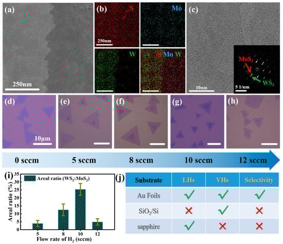 (a) TEM image of as-grown WS2/MoS2 VH; (b) the corresponding energy dispersive X-ray spectroscopy (EDS) elemental maps of the region displayed in (a); (c) HRTEM image of an as-grown WS2/MoS2 VH. The corresponding selected area electron diffraction (SAED) pattern is shown in the inset; (d–h) optical microscopic images reveal the morphology evolution of the as-transferred WS2/MoS2 heterostructures under a different gas flow rate of hydrogen; (i) bar chart of the WS2:MoS2 areal ratio calculated based on (d–h) under different H2 flow rates; (j) selectivity table to summarize the synthesis of LHs/VHs in various substrates.