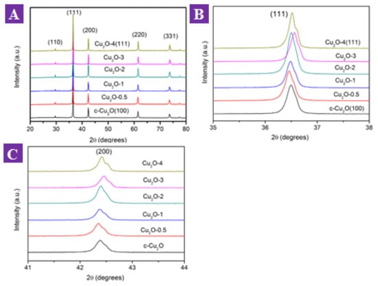 The structure information and phase purities of as-prepared samples were investigated by X-ray diffraction (XRD). As shown in Figure 1A, it is the unique diffraction pattern of the Cu2O nanocrystals, namely the peaks at 2θ of 29.3°, 36.2°, 42.1°, 61.3°, and 73.4° belonging to the (110), (111), (200), (220), and (311) planes of Cu2O, respectively, which correspond to the cubic bulk of Cu2O (JC-PDS file No. 78-2076) [26,35]. Beyond that, other peaks were negligible, which implied that as-prepared Cu2O nanocrystals are relatively pure. The diffraction patterns of Figure 1B,C are the images of (111) and (200) planes of Cu2O samples, respectively. It can be seen that there is a very small peak to the right of the main peak here, which gradually becomes larger as the exposed surface of Cu2O changes, probably due to the influence of morphology, size or exposed crystal surface.