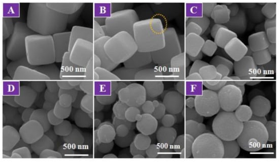 The geometric shape and microstructures of as-prepared samples have been analyzed by scanning electron microscopy (SEM). As shown in Figure 2A, in the absence of PVP, the Cu2O nanoparticles possess cubic morphology and a smooth surface, which is corresponding to the previous reports [19,27,34,36]. The length of the c-Cu2O(100) cube was about 500 nm. When adding different amounts of PVP, the corners of cubic Cu2O disappeared and became a round arc structure as shown in the yellow circle of Figure 2B, and the sizes of the nanoparticles barely changed. The round arc of the corners of c-Cu2O(100) gradually enlarged after continuing addition of PVP to 1 g as shown in Figure 2C; the diameter of Cu2O-1 was about 400 nm. When the amount of PVP increased to 2 g, the morphology of the nanoparticles was nearly spherical, with uneven size from 400 to 100 nm (Figure 2D). When PVP was increased to 3 g or 4 g, the Cu2O-3 and Cu2O-4(111) displayed spherical structures, where Cu2O-4(111) had a more complete sphere shape Cu2O-3, as shown in Figure 2E,F.