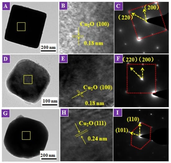 Figure 3. The detailed crystallographic features of the Cu2O nanocrystals. (A,D,G) the bright TEM images, (B,E,H) high-resolution TEM (HRTEM) image, (C,F,I) the corresponding SAED of c-Cu2O(100), Cu2O-1 and Cu2O-4(111), respectively. The yellow square border in (A,D,G) represents the selected area on the sample to be enlarged for HRTEM.