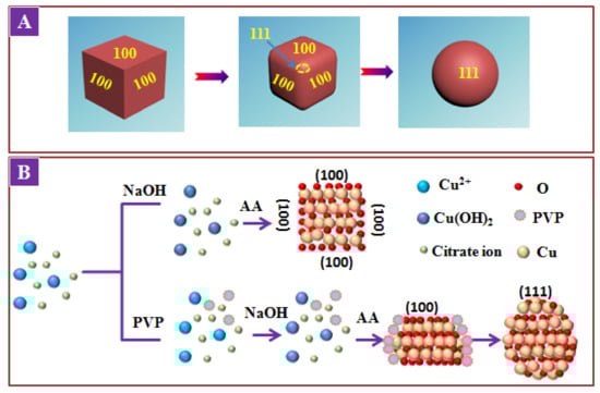 Based on the above results, the relationship between Cu2O nanocrystals’ shape and surfactant PVP has been discussed. As shown in Figure 4A, the three-dimensional models clearly demonstrated the exposed surfaces’ evolution process from (100) to (111) with the shape of Cu2O nanocrystals changing from cube to sphere after increasing the amount of PVP, respectively. Therefore, it is not difficult to find that PVP acts as a capping agent, and it can be preferential in adsorption on the {111} planes of the Cu2O nanocrystals to protect (111) facets as shown in Figure 4B [19]. Therefore, by adjusting the amount of PVP to control the adsorption kinetic of the surface activities on {111} facets, the area of (111) surfaces enlarge gradually until completely exposing the (111) facets by increasing the amount of PVP to 4 g. According to reports in the literature, sodium citrate was used as a chelating agent to adjust the size of Cu2O nanocrystals via nucleation-controlled route [34].