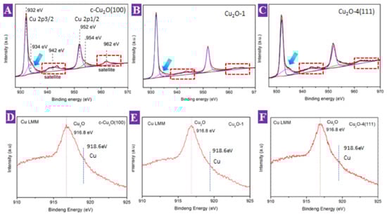 XPS is used to analyze the surface composition and electronic environment of corresponding elements for as-prepared samples. XPS also can be used to further verify the purity of samples. As shown in Figure S3, the peaks of O, Cu and adventitious C elements can be clearly observed, with no other peak emerging, which indicated that the as-prepared Cu2O nanocrystals (c-Cu2O(100), Cu2O-1 and Cu2O-4(111)) were highly pure [38]. For further investigating Cu’s chemical state on the surface of samples, the high-resolution XPS spectra of Cu 2p were also examined. As shown in Figure 5A–C, there were two main characteristic peaks corresponding to Cu 2p1/2 and Cu 2p3/2, and the distance between the two main peaks is about 19 eV, which was in agreement with the previous reports [39,40,41]. There are several shake-up satellite peaks emerging at nearby 942 and 952 eV (red dotted box mark), as previously reported [39], approximately 9 eV higher than the value of the Cu 2p3/2 peak; these peaks may be attributed to multiple excitations in copper oxides such as the characteristic peaks of CuO. There is a slight bulge that can be observed to the right of the peaks of Cu 2p3/2, as shown in Figure 5A–C (blue arrow mark), which indicated that there may be Cu2+. The peaks at 932 eV (Cu 2p3/2) and 952 eV (Cu 2p1/2) can be assigned to Cu+ (originated from Cu2O) and the peaks at 934 (Cu 2p3/2) and 954 eV (Cu 2p1/2) corresponding to the state of Cu2+ (originated from CuO) [42,43]. The existence of CuO indicates that the surface of c-Cu2O(100) is oxidized from Cu2O to CuO. The intensity of the peak of Cu+ 2p3/2 is much larger than that of the peak of Cu2+ 2p3/2, indicating that the dominant component of c-Cu2O(100) nanocrystals is Cu2O, which is consistent with report [43]. Comparing with Figure 5A–C, there is less oxidation which occurs on the surface of Cu2O-1. The successful preparation of Cu2O nanocrystals is also verified by the Cu LMM spectrum, as shown in Figure 5D–F. The only peak can be observed at 916.8 eV corresponding to Cu+; there is no peak of Cu (at 918.6 eV) emerging. As mentioned previously, the result of XRD indicated that the as-prepared samples only possessed a Cu2O phase, which was different from that of XPS because the XPS technique is used to study the surface of a sample, unlike XRD which is for the bulk [40]. These further verified that very little oxidation took place on the surface of c-Cu2O(100) and Cu2O-4(111). From the O 1s XPS spectrum in Figure S4, we observe that the prepared samples had three peaks at about 530.1 eV, 531.5 eV and 533.0 eV. The peak at 530.1 eV was attributed to the oxygen of Cu2O and CuO. The peak at 531.5 eV was assigned to adsorbed oxygen on the surface. The peak at 533.0 eV was associated with the adsorbed water molecules [23].
