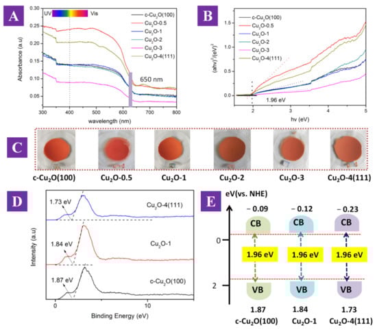 The UV-vis absorption spectroscopy and XPS valence spectra were performed to investigate the optical absorption property and electronic structure of the as-prepared samples [44,45]. As shown in Figure 6A, the light absorption edges of Cu2O nanocrystals were all around 650 nm (purple column mark), which indicated that Cu2O nanocrystals possess good optical absorption property, which can be excited by visible light. However, there was no relationship between light absorption and morphology in this work, namely, Cu2O-0.5 showed the strongest absorption but Cu2O-3 showed the weakest absorption in the visible light region. The band gap value obtained from the square root plots of (αhν)2 versus energy (hν) of samples is shown in Figure 6B; all the as-prepared samples have the same band gap of 1.96 eV, which corresponds to the result of UV-vis absorption spectroscopy. The color of the samples also can further verify the light absorption performance as shown in Figure 6C; all the samples have the same color of brick red. For investigating the band position of the as-prepared samples, the valence band XPS spectroscopy was carried out. As presented in Figure 6D, the samples c-Cu2O(100), Cu2O-1 and Cu2O-4(111) displayed the valence band (EVB) maximum of 1.87, 1.84 and 1.73 eV, respectively. According to the band gap value in Figure 6B, combined with calculation formula Eg = EVB − ECB (ECB is conduction band) [46,47], the minimum ECB of c-Cu2O(100), Cu2O-1 and Cu2O-4(111) occur at about −0.09, −0.12 and −0.23 eV, respectively (Figure 6D). Based on the above results, it is found that the obtained samples have almost the same light absorption performance except the minor differences in band position.