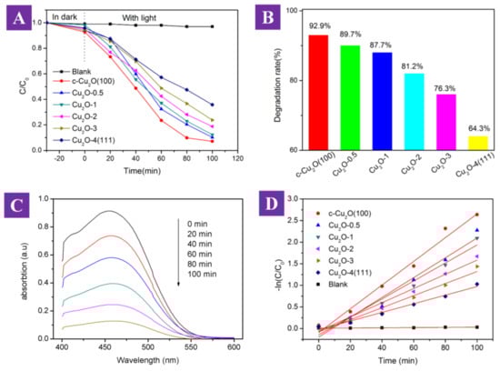 The photocatalytic degradation MO test was carried out to evaluate photocatalytic performance of the obtained samples under visible-light irradiation. As shown in Figure 7A, MO was barely adsorbed by the Cu2O nanocrystals during the absorption–desorption balance test under in dark. For comparison, a blank experiment also implied this, and the MO concentration remained unchanged over time in the absence of catalysts, indicating that MO is quite stable. When adding Cu2O nanocrystals, the concentration of MO decreased with the reaction time under visible-light irradiation. Among them, c-Cu2O(100) exhibited the best photocatalytic degradation performance and could completely decompose MO in aqueous solution within 80 min. It is notable that the photocatalytic degradation performance is related to the crystal plane of Cu2O nanocrystals; the order of degradation efficiency for obtained samples was: c-Cu2O(100) (92.8%) > Cu2O-0.5 (89.7%) > Cu2O-1 (87.7%) > Cu2O-2 (81.2%) > Cu2O-3 (76.3%) > Cu2O-4(111) (64.3%) as shown in Figure 7B. Figure 7C shows the UV-vis absorption spectra of MO with c-Cu2O nanocrystals under visible-light irradiation; the concentration of MO decreased gradually under continuous light irradiation. The degradation of MO could be described by a pseudo-first-order reaction with a modification-simplified Langmuir–Hinshelwood model as aforementioned in Equation (1), as shown in Figure 7D. The corresponding rate constant K of as-prepared samples c-Cu2O(100), Cu2O-0.5, Cu2O-1, Cu2O-2, Cu2O-3 and Cu2O-4(111) are deduced to be 0.027, 0.023, 0.021, 0.016, 0.014 and 0.010, respectively. Based on the above results, it is found that the photocatalytic performance decreases gradually with the shapes of Cu2O nanocrystals changing from cube to sphere and the exposed surfaces changing from (100) to (111).