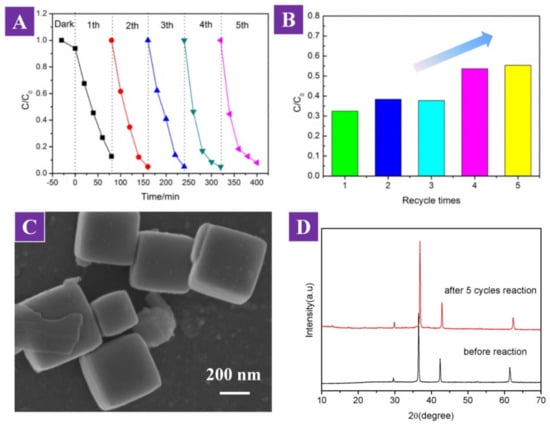 Meanwhile, the MO photodegradation recycling experiments were carried out to investigate the stability of the c-Cu2O(100) nanocrystals. As shown in Figure 8A, the photocatalytic degradation rate nearly remained constant over five sequential cycles within 80 min under visible-light irradiation, indicating that c-Cu2O(100) nanocrystals possess a good stability during the photocatalytic reaction process. It is worth noting that the photodegradation rate increased gradually in the first 20 min for five cycles as shown in Figure 8B. According to the previous report [43], Cu2O is easily oxidized into CuO under illumination, except when adding a hole (h+) scavenger. Therefore, MO may act as a h+ scavenger, and facilitate rapid separation of electron and hole pairs, while leaving excess electrons, which may reduce CuO on the surface of c-Cu2O(100) to Cu2O. This process is beneficial for enhancing photocatalytic performance. SEM and XRD measurements were carried out to investigate catalysts after five cycles. As shown in Figure 8C, the shape of c-Cu2O(100) showed no change and remained in the cubic morphology after five cycles. The results of XRD showed that the crystal structure of c-Cu2O(100) after five cycles is consistent with that of pristine c-Cu2O(100) nanocrystals (Figure 8D). These results of SEM and XRD further demonstrate that c-Cu2O(100) nanocrystals possess a good stability.