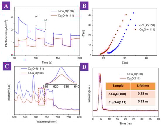 To gain deep insights into the separation efficiency of photogenerated electron–holes, PEC tests, PL and TRPL spectra performance were carried out [48]. Photocurrent responses and electrochemical impedance spectra are shown in Figure 9A,B, respectively. From these figures, it can be found that c-Cu2O (100) has a stronger photocurrent and weaker electrical resistance than Cu2O-4(111). This indicated that crystal surface (100) of Cu2O possessed higher electrical conductivity and carrier transmission speed than that of crystal surface (111). As shown in Figure 9C, c-Cu2O(100) displayed a lower PL intensity, which indicated a higher separation efficiency of the charge carriers than that in Cu2O-4(111). The TRPL spectra were further detected to understand the lifetime of photo-generated charge carriers as shown in Figure 9D. The lifetimes of c-Cu2O(100) and Cu2O-4(111) were 0.23 ns and 0.33 ns, respectively, indicating that the photo-generated carriers of c-Cu2O(100) were captured more rapidly by the reactive substrate and thus were able to drive the redox reactions [49]. Furthermore, c-Cu2O(100) had higher separation efficiency for electrons and holes.