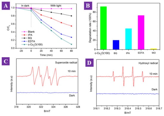 In order to identify the main reactive species for the photocatalysis photodegradation MO process over Cu2O nanocrystals, active-species-trapping experiments were carried out. In detail, BQ, IPA and EDTA were introduced as scavengers for ∙O2, ∙OH and holes [30,31,44,50], respectively. As shown in Figure 10A, the addition of EDTA slightly influenced the photocatalytic degradation rate of MO, which implied that few holes participated in the photocatalytic degradation reaction. Under the same condition, the addition of BQ and IPA obviously decreased the degradation rate of MO, which indicated that ∙O2 and ∙OH are the key reactive species for MO oxidation. The corresponding MO degradation rate over c-Cu2O(100) with the addition of BQ, IPA and EDTA are 20.2%, 45.1% and 73.4% (Figure 10B). To further confirm the mechanism of enhanced photocatalytic degradation on Cu2O nanocrystals, the ESR was carried out to investigate the active radicals in solution. Spin capture reagent DMPO can be used to detect ∙OH and ∙O2 in aqueous and methanol solution, respectively. DMPO can produce an ESR signal by reacting with the oxygen-containing group but it did not produce an ESR signal [51]. As shown in Figure 10C,D, no characteristic peaks of DMPO-∙O2 and DMPO-∙OH can be found over the as-prepared Cu2O nanocrystals in the dark, which indicate that Cu2O nanocrystals cannot produce an ESR signal without irradiation. As shown in Figure 10C, after being given visible-light irradiation for 5 min, six characteristic peaks can be clearly observed, which belong to the characteristic signals of DMPO-∙O2 [52]. With the increase in the light period length, the intensity of the ESR signal was significantly enhanced, which indicated that ∙O2 radicals can be produced in the photocatalytic degradation reaction under visible-light irradiation. Similarly, four obvious characteristic peaks with the relative intensity of 1:2:2:1 can be observed after giving 5 min irradiation, which correspond to the characteristic signals of DMPO-∙OH. The signal intensity was obviously enhanced when increasing the irradiation time from 5 min to 10 min as shown in Figure 10D, which confirmed that the ∙OH radicals can be produced in the photocatalytic degradation under visible-light irradiation.