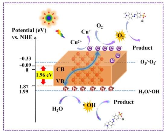 According to the previous reports and above results, the possible photocatalytic mechanisms are proposed. As shown in Figure 11, under visible-light irradiation, the Cu2O semiconductor is excited to generate e-h+ pairs. e migrates to the CB and leaves h+ on the VB of Cu2O. e can react with molecular oxygen in solution to form ∙O2 radicals (Equation (3)). Simultaneously, h+ reacts with OH- in H2O to form ∙OH radicals (Equation (6)). However, the CB position of Cu2O (about −0.09 eV) is more positive than the redox potential of O2 to ∙O2 (−0.33 eV) and the VB position of Cu2O (1.87 eV) is more negative than the redox potential of H2O to ∙OH (1.99 eV) [54]; these results did not correspond with those of ESR. This may be because the partial oxidation of the Cu2O surface generates CuO, which constitutes the heterojunction and thus affects the band gap position [55]. According the previous report [43], the reasons why Cu2O self-photooxidation does not happen in the absence of h+ scavenger may be that the MO dye acts as a h+ scavenger or generates CuO (Equation (8)) is reduced to Cu2O by accumulated photogenerated e- in the CB of Cu2O (Equation (5)). Therefore, the redox pair of Cu2+-Cu+ has been formed and plays an important role in the photocatalytic reaction. For example, it enhances the separation and transfer of photogenerated charges. The circulation of the redox pair of Cu2+-Cu+ can generate more reactive species to improve the degradation performance [56]. Cu+ may be oxidized into Cu2+ by holes and Cu2+ may be reduced by electrons. The close coordination between “Cu2+-Cu+” redox pairs and electron–hole teams under light improves the stability of the catalytic system. Subsequently, ∙O2, h+, and ∙OH radicals are the main active species to decompose MO dye to CO2 and H2O, and the possible reaction Equations (4), (7), and (9) are displayed, respectively.