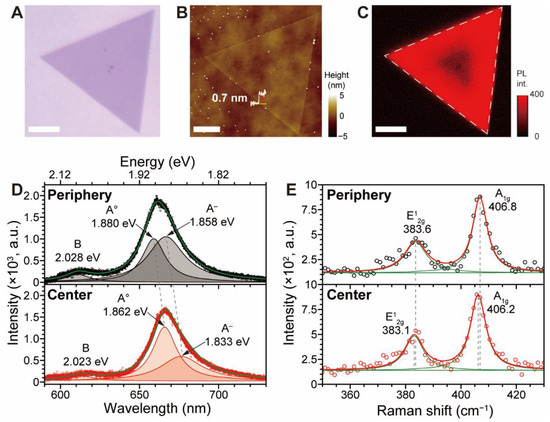 The characterizations of the as-grown MoS2 grains by various methods: (A) OM image; (B) the corresponding AFM height topography; (C) PL image with emission filtered using a 660 nm bandpass filter. Scale bars: 10 μm. (D) PL spectra obtained from central and peripheral parts of MoS2 and its Lorentzian deconvolutions to indicate A°, A−, and B, respectively. Dashed lines are drawn for comparison of the position. (E) The corresponding Raman spectra (circles) and its Lorentzian deconvolutions (green).