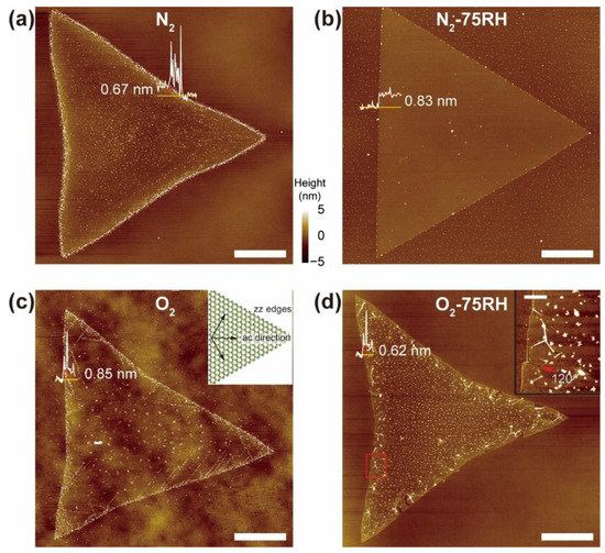 The effects of various environments on the morphology of MoS2 were first examined using AFM (Figure 2a–d). All crystals under the four conditions have triangular shapes and heights (white traces) varying from 0.6 to 0.85 nm, indicating monolayer MoS2. While the N2 and N2-75RH samples (Figure 2a,b) have topographies similar to the as-grown material, surprisingly, the MoS2 subjected to an O2 atmosphere (Figure 2c) displays few micrometer-long directional line defects originating from the edges. These defects are more visible in the phase image (Figure S2C,D), compared to those from N2-treated samples. Notably, the angles of the line defects against zz edges were ca. 30, 90, and 150° (see inset of Figure 2c), suggesting ac-directional line defects. This result contrasts with the report in [19] that aging of CVD-grown MoS2 and WS2 under ambient environmental conditions leads to random cracks and defects. This result suggests that the conditions for CVD growth affect the oxidative defects. Furthermore, the O2-75RH-treated sample (Figure 2d) shows that unzipping occurs from the edges in the ac directions. The inset in Figure 2d shows that unzipping, instead of occurring at ac line defects, occurs at the edges, and that crack directions are at 120° from each other (see red arrows for the intersection). This result suggests that dry and humid O2 oxidations promote stepwise transformations in the MoS2 crystal, from line defects to eventual unzipping.