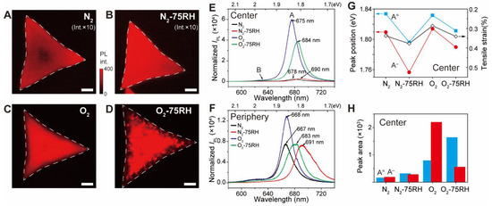 PL images, spectra, and analysis at central and peripheral positions of MoS2 crystals after incubation for two weeks under each condition. PL images from: (A) N2; (B) N2-75RH; (C) O2; (D) O2-75RH samples. Scale bar: 10 μm. PL intensities of (A,B) were multiplied for visual comparison. Normalized PL spectra from (E) central, and (F) peripheral regions with respect to the 520.89 cm−1 Si peak. (G) PL peak position and (H) PL peak-area changes of Ao and A− derived by each treatment from central regions.