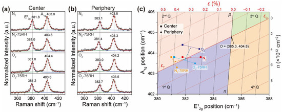 Raman spectroscopy is a powerful tool for gaining an understanding of the quantitative ε and n- or p-doping density of MoS2, because these parameters are closely related to chemical bond strengthening or weakening, which alters the vibrational behavior. A previous study [35] showed that ε and n contributions in graphene are quantitatively associated with two Raman bands (i.e., G and 2D modes). A similar concept has been utilized to evaluate ε and n for monolayer MoS2 [32,33,34]. To apply this treatment, we chose the frequencies from the spectra of suspended MoS2 as an origin for the unperturbed, pristine state [44,45]. Utilizing the published values for ε and n of monolayer MoS2 [11,46], an ε–n coordinate system in units of % and 1 × 1012 cm−2 (Figure 4c) was devised in a coordinate framework comprising two prominent Raman bands (E12g, A1g). Specifically, Figure 4c is a plot of ε (black dashed line) and n (red dashed line), with an origin O = (E12g, A1g) = (385.3, 404.8), corresponding to pristine MoS2. In addition, εC values are compressive strains, and n and p denote n and p doping, respectively. Representative crystal spectra acquired from the center and periphery are shown in Figure 4a,b. It is noteworthy that Raman bands near 275 cm−1 corresponding to MoO3 are not present [21]. As shown in Figure 4c, the central (peripheral) position of the N2 sample displays two bands at 381.8 (383.1) and 403.8 (403.8) cm−1. In terms of strain doping, the central part has ε–n coordinates of (0.34, −0.4), and the peripheral part has coordinates of (0.2, 0.7). This result suggests that while εT decreases from the center to the periphery, in accordance with previous findings [27,36], a slight p- to n-doping transition occurs simultaneously. The doping of the N2-treated sample is likely to be related to the interaction of the basal MoS2 with the SiO2/Si substrate, which acts as a p dopant [29,35]. Compared to the N2-treated sample, the N2-75RH sample (orange) exhibited much higher εT values (from 0.37 to 0.42%) at both the central and peripheral positions and experienced only a negligible doping density change. This result further supports the idea of the presence of water-induced tensile strain. This result underscores the advantage of utilizing an ε–n plot for analyzing the spectroscopic data, because otherwise the p-doping and εT results are both included in a similar downshift in vibrational frequencies [11].