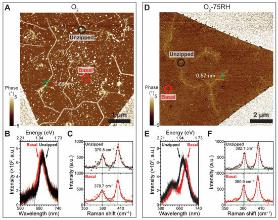 The results suggest that regardless of the environmental conditions used, MoS2 samples possess considerable εT, albeit with different doping densities. However, only O2-treated crystals experienced line defects and unzipping. This observation prompted us to perform an experiment in which MoS2 crystals were exposed to O2 and O2-75RH environments for three months. Figure 5A,D show the respective AFM phase images, facilitating the visualization of unzipping. Remarkably, both samples show zz-directional line unzipping with respect to zz-terminated edges. The O2-treated sample had a wider unzipping width compared to the O2-75RH-treated MoS2. Unzippings occurred at 120° with respect to each other. Although unzipping near the periphery is ac-directional with respect to the edge, it changes to the zz direction in the basal plane. This finding stands in stark contrast to the etched triangular pit of exfoliated MoS2 prepared by high-temperature annealing (i.e., 300 °C) [21,47] and the random cracks incubated at room temperature [19]. Inspection of the normalized PL spectra of the O2-incubated crystal (Figure 5B) shows that both unzipping and basal positions occur at ~670 nm, which corresponds to the near-absence of tension. Similarly, both Raman spectra (Figure 5C) show similar interpeak separations (i.e., ~25 cm−1). A similar unzipping behavior but associated with a larger difference in εT was observed for the O2-75RH-treated sample. In this case, the PL peak position (Figure 5E) of the unzipped region (black circle in Figure 5D) displayed a large blue shift (20 nm) compared to that from the basal plane, showing that the εT was relieved. Raman spectra analysis (Figure 5F) further supported the fact that the basal plane has a larger εT (larger interpeak separation) compared to that for the O2-treated crystal.