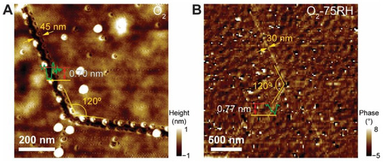 (A) AFM height image of line unzipping from O2-treated MoS2 sample. (B) AFM phase image of line unzipping from O2-75RH-treated MoS2 sample. It is noteworthy that the phase image was selected to display cracks. Line profile was obtained from the corresponding height image.