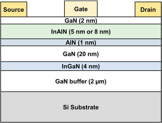 Schematic cross-section of the fabricated InAlN/GaN HEMT with two different InAlN barrier thickness (8 nm and 5 nm, respectively).