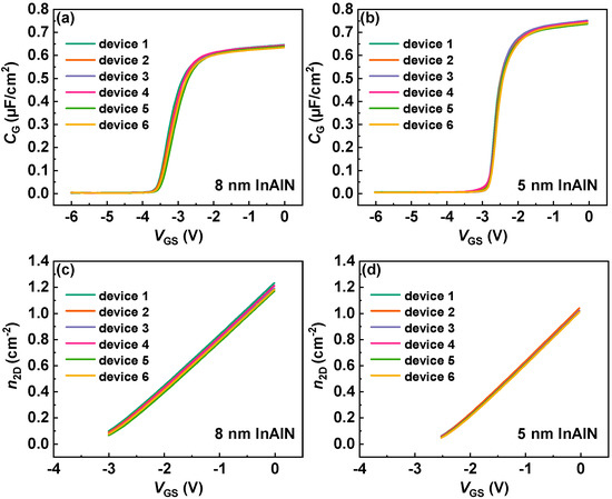 Gate capacitance (CG) of the InAlN/GaN diode with (a) 8 nm InAlN and (b) 5 nm InAlN, respectively. Two-dimensional electron gas electron density (n2D) of the InAlN/GaN diode with (c) 8 nm InAlN and (d) 5 nm InAlN, respectively.