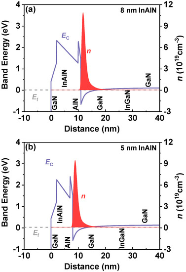 Simulated band structure and 2DEG electron density as a function of the distance from the material surface of the InAlN/GaN heterostructure with (a) 8 nm InAlN and (b) 5 nm InAlN, respectively.
