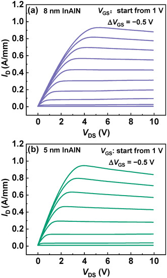 Output characteristics of the InAlN/GaN HEMTs with (a) 8 nm InAlN and (b) 5 nm InAlN, respectively.