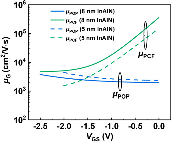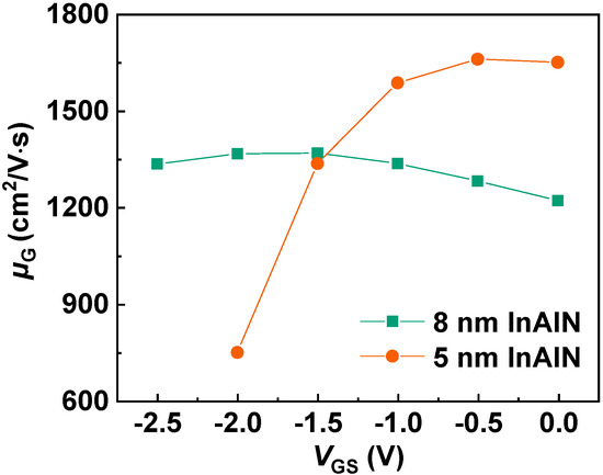 Figure 5 depicts the extracted µ versus VGS for both samples. At VGS = 0 V, µ of the devices with 8 nm InAlN and 5 nm InAlN is 1221 and 1651 cm2/V∙s, respectively. The improved electron mobility with a thinner barrier is also confirmed with the Hall measurement (1242 cm2/V∙s for 8 nm InAlN and 1663 cm2/V∙s for 5 nm InAlN) and the electron mobility of Fat-FETs (with LG of 96 µm and LSD of 100 µm, 1101 cm2/V∙s for 8 nm InAlN and 1670 cm2/V∙s for 5 nm InAlN) [29].