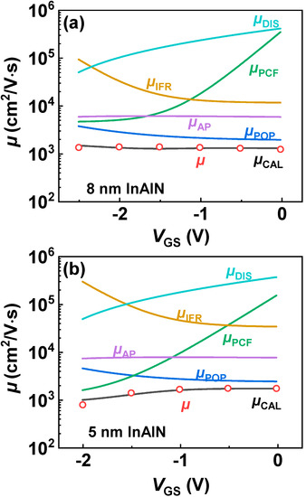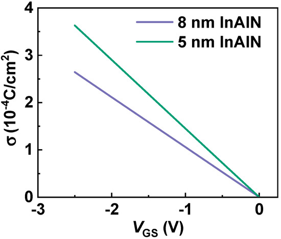 where ε is the dielectric constant of GaN and WG is the gate width. Based on inverse piezoelectric effect, σ can be calculated by using σ = ρ0 − ρG = −ne332VGS/(C33d) [32]. n is the fitting parameter, and e33 and C33 are the piezoelectric coefficient and the elastic stiffness tensor of InAlN, respectively. d is the gate-to-channel distance, which is the sum of the thicknesses of the GaN cap layer (2 nm), InAlN barrier (8 or 5 nm), and AlN interlayer (1 nm). Figure 9 depicts the calculated σ versus VGS with an 8 and 5 nm InAlN barrier. σ increases with the decreased TB and VGS, resulting in the enhanced PCF scattering as the InAlN barrier thickness and VGS decrease. Therefore, µPCF increases with VGS. Because the device with a 5 nm InAlN barrier shows an enhanced PCF scattering, µ increases with VGS. This fact is more pronounced, especially in the more negative VGS region. For the device with an 8 nm InAlN barrier, the PCF scattering became weaker and the POP scattering dominates µ, leading to a slight decrease in µ when VGS increases.