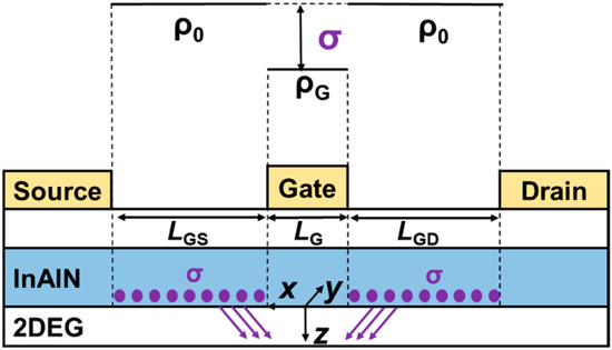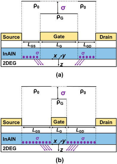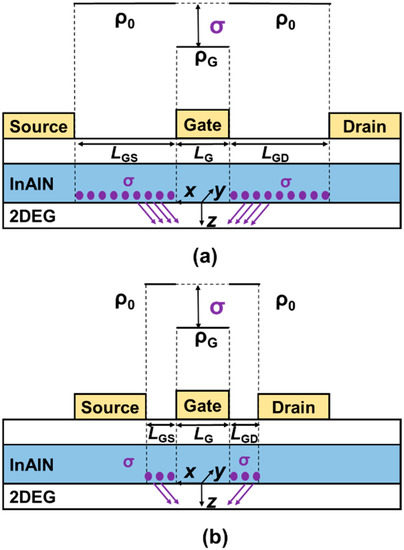 Schematic of the additional polarization charge (σ) distribution in InAlN barrier with (a) large and (b) small gate length LG. The source–drain spacing LSD is fixed.