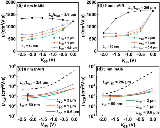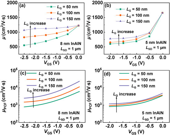 (a,b) µ versus VGS for the devices with LSD of 1 µm and LG of 50, 100, 150 nm with 8 nm and 5 nm InAlN. (c,d) Calculated µPCF versus VGS of the same devices with 8 nm and 5 nm InAlN.
