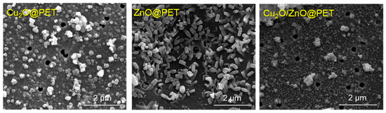 Figure 1 shows electron micrographs of the synthesized composite TeMs. In these SEM images, besides the nanochannels that are still visible in places, the accumulation of nanoparticles is clearly visible as an abundant phase covering the entire surface of PET TeMs and the interior of the nanochannels. Based on the gravimetric analysis, the active phase loading rates per 1 cm2 of the composite were 0.28 mg, 0.13 mg and 0.35 mg for ZnO@PET, Cu2O@PET and Cu2O/ZnO@PET, respectively.