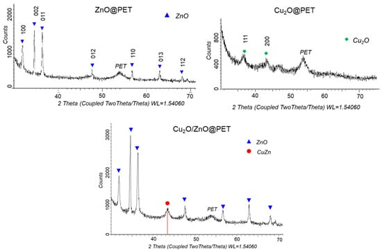 X-ray diffraction patterns of ZnO@PET, Cu2O@PET and Cu2O/ZnO@PET composites.