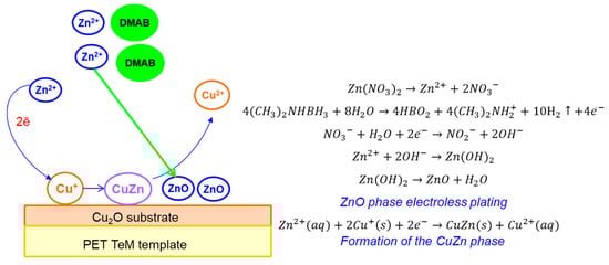 In addition to the main ZnO phase in the XRD pattern of the mixed Cu2O/ZnO@PET composite, an additional characteristic peak was observed at 2θ = 43.3°, attributed to the (110) plane of CuZn substitutional solid solution (SSS) phase (JCPDS: 01-071-5032 intermetallide zhanhengite). The crystallite size of this SSS phase was calculated as 11.97 nm based on the (110) peak. Figure 4 illustrates the proposed formation mechanism of CuZn SSS based on the galvanic replacement reaction on the Cu2O substrate under the condition of electroless plating at 70 °C. We consider that some Cu atoms of the minor component (Cu2O) are substituted for the atoms of the major ZnO component on the lattice positions normally occupied by oxygen atoms [60]. Along with CuZn phase formation, relevant reactions for ZnO plating in the presence of DMAB are presented in Figure 4.