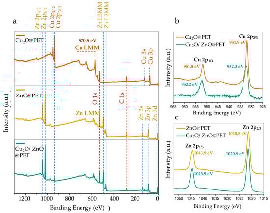 Oxides of copper (i.e., CuO and Cu2O) are promising materials because of the potential they offer for applications in catalysts, electronic interconnects, sensors and the corrosion of alloys, among others [34,61,62]. Determining the true oxidation state of copper in these systems is crucial to understand the chemical and physical properties, along with the practical behavior in terms of efficiency. X-ray photoelectron spectroscopy (XPS) is one of the most powerful techniques for determining the oxidation states of metals. Figure 5a shows the typical XPS wide-survey spectra of Cu2O@PET, ZnO@PET and Cu2O/ZnO@PET membranes. C and O peaks were detected around 285 eV and 531 eV, respectively, as shown in wide-survey spectra. The detected carbon is related to the carbon atom of the PET TeMs substrate. Aside from these two elements, all characteristic peaks of metal atoms (Cu and Zn) found in structures were identified in the spectra (Figure 5a).