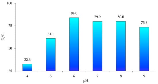 The pH of the solution is one of the key parameters of photocatalytic processes. Changes in pH values affect the surface charge and degree of ionization of the catalyst, the electrostatic interactions between the catalyst surface and the reactant molecules and the distribution of functional groups in the catalyst’s active centers, as well as the chemical composition of the solution [70,71]. To find the efficiency of Czm degradation in the presence of ZnO@PET, we carried out a series of experiments in the pH range of 4–9, whereby the required pH level was adjusted using 1.0 M HCl(aq) or NaOH(aq). The pesticide concentration was 1.0 mg/L and the temperature was 30 °C. As can be seen from the data presented in Figure 6, the highest degradation efficiency of Czm was obtained at pH 6.0. When the pH was increased from 4 to 6, the removal efficiency increased from 32.52% to 83.7%. However, with a further increase in pH up to 9, the Czm removal efficiency remains practically unchanged. In addition, long-term operation of PET-based composites in alkaline environment leads to degradation of the polymer matrix. Therefore, pH 6.0 was chosen as optimal and further experiments were conducted at this pH.