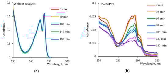 Figure 6 shows the time variation spectra of the absorbance of Cmz in the presence and absence of the ZnO@PET composite as a representative catalyst among 3 membranes. As can be seen in Figure 7a, in the absence of the catalyst, Cmz does not degrade over time, as can be seen from both the invariant forms of the absorption bands and their intensities. However, in the presence of ZnO@PET (Figure 7b), the decrease in intensity of the absorption bands and the significant changes in the band shapes indicate the degradation of Cmz and the formation of new degradation products.